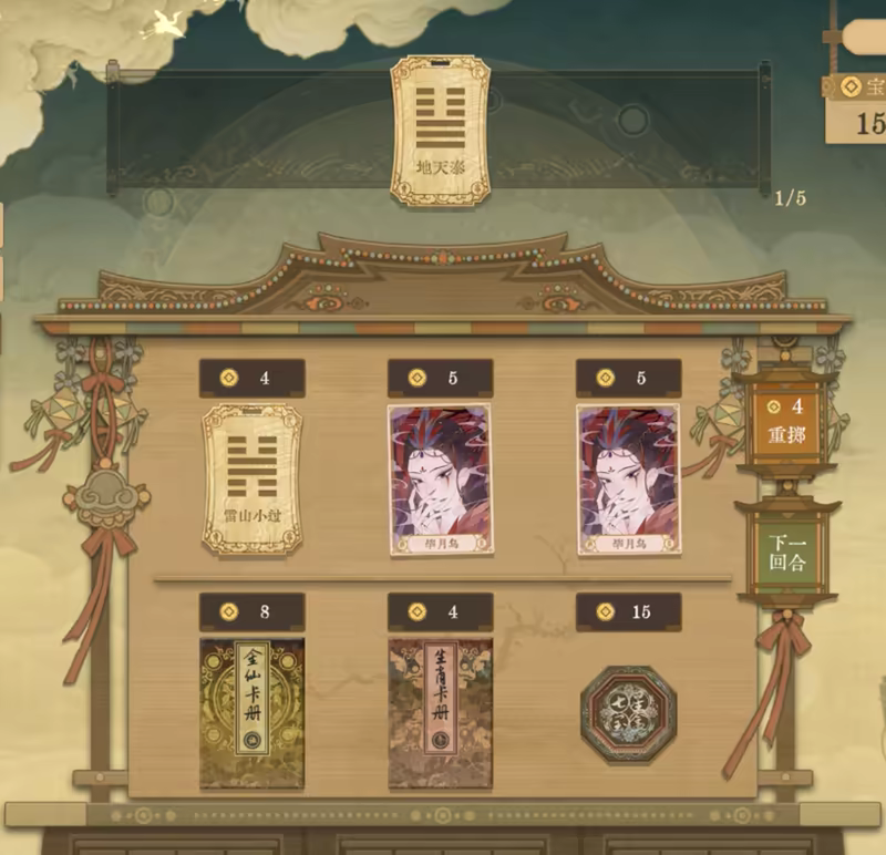 3、局外升级系统(构筑您的卡牌组合):玩家点击【收藏】进入【六十四卦象】页面,利用卜卦值【开始卜卦】,可获得新的卦象牌,并且能选择对这张卦象牌进行升级和降级,会影响这张卦象牌在商店出现的概率(开局会赠送10个卜卦值,玩家每次升级会获得卜卦值);