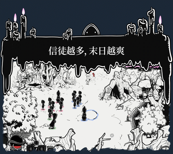 《Worship》的魅力在于它大胆、亵渎的主题、语气和世界观;在游戏中,你可以找到黑色幽 默的血祭仪式,也能举办奢华的邪恶祭献。《Worship》世界的视觉效果也非常特别,以黑白 墨水素描画风为底,点缀以鲜艳的色彩和手绘动画,搭建起一片诡谲的世界。它的艺术风格既 可爱又独特,遍布游戏的黑暗幽默元素更是使干坏事都变得如此有趣。一个既阴森恐怖又可爱 搞怪的世界正在等待你来探索。